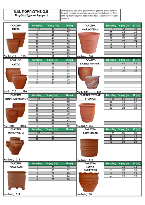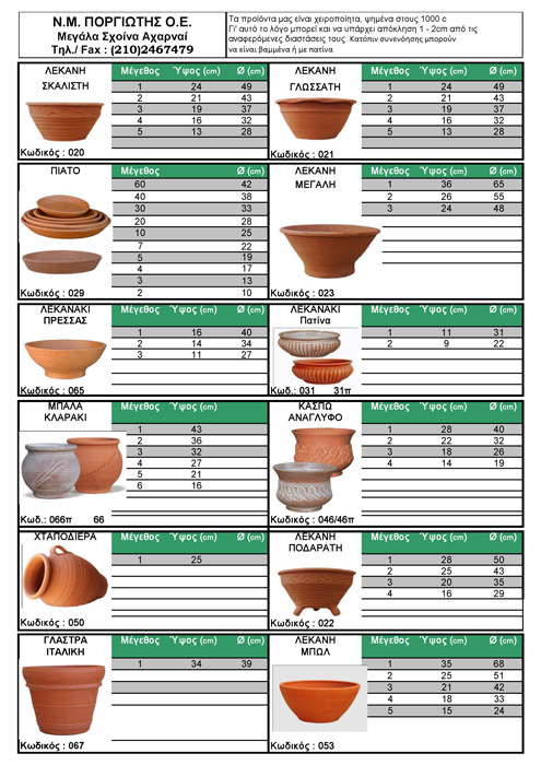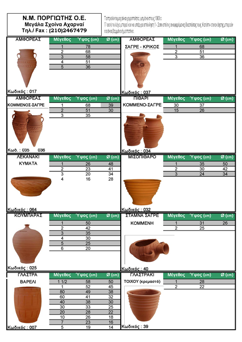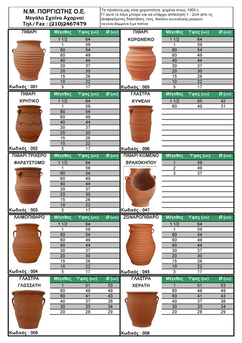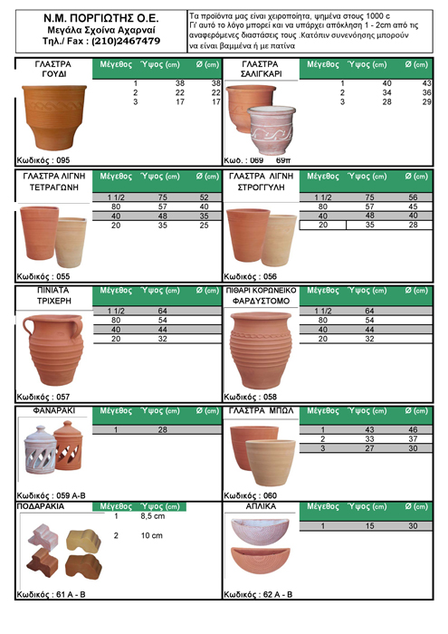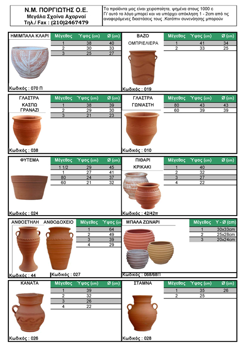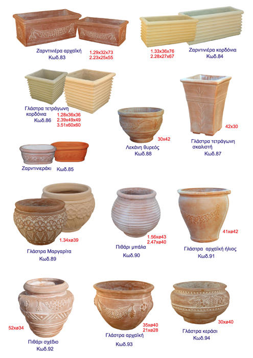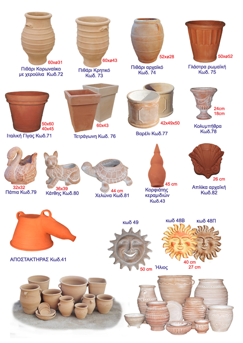Σε μας θα βρείτε πήλινα είδη κήπου (πιθάρια, γλάστρες , ζαρντινιέρες αμφορείς, στάμνες, λεκανάκια )και διακοσμητικά είδη σε μεγάλη γκάμα όπως, επιτοίχιες απλίκες και ήλιους, ανθοδοχεία κ.α.. Κατόπιν παραγγελίας όλα μας τα είδη μπορούν να παραχθούν σε τερακότα, λευκή πατίνα και σε διάφορες αποχρώσεις (κίτρινο, ώχρα, μπέζ, μπορτώ κ.α.)
